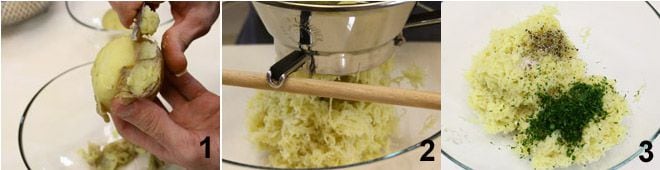 Para preparar los cazzilli palermitanos comenzad lavando y cociendo las patatas (mejor si enteras con la piel) en agua con sal, después escurridlas y dejadlas enfriar completamente (podéis cocerlas incluso la noche anterior). Pelad las patatas 1 y pasadlas por el pasapurés 2 asegurándoos de obtener un puré fino y sin grumos. Añadid al puré la sal, la pimienta, el perejil picado (o la menta) 3,