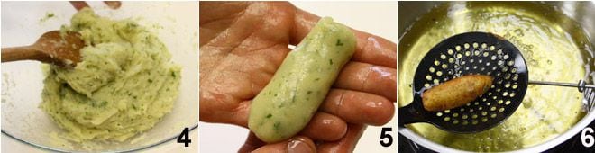 mezclad bien hasta obtener una mezcla homogénea 4; untad vuestras manos con aceite de oliva y luego tomad una pequeña cantidad de la mezcla (deberéis obtener una croqueta del tamaño de un dedo medio) y formad un cazzillo 5, que colocaréis sobre una bandeja. Continuad así hasta terminar la masa. Freíd los cazzilli en aceite de oliva virgen extra (o de cacahuete) a unos 175°-180° (no superéis nunca los 180°). Comenzad la fritura haciendo una prueba con un solo cazzillo 6: si se abre o absorbe demasiado aceite quedando blando por dentro deberéis añadir 2-3 cucharadas de harina, aunque la receta original no lo prevea, ya que las freidurías sicilianas utilizan un tipo particular de patatas que no hace necesaria esta adición. Freíd entonces todos los cazzilli y servidlos inmediatamente!