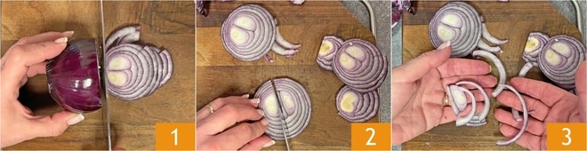 Para preparar la cebolla crujiente, limpia y corta las cebollas rojas en rodajas de un grosor de aproximadamente 7 mm 1, luego divide cada rodaja por la mitad 2 para obtener tiras 3.