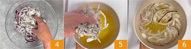 Harina las rodajas de cebolla 4 y elimina el exceso de harina. Calienta el aceite de semillas y sumerge un puñado de cebollas a la vez en el aceite caliente 5. Fríe las cebollas girándolas a menudo con una espumadera hasta que cambien de color 6.