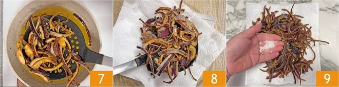 Una vez doradas uniformemente, escúrrelas 7 y colócalas sobre papel absorbente 8. Deja enfriar completamente y espolvorea con sal gruesa 9. ¡Tu cebolla crujiente está lista para ser disfrutada!