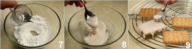 Preparad el glaseado blanco uniendo en un bol el azúcar glas y poca agua hirviendo a la vez 7 hasta obtener una crema densa (podéis corregir la densidad con otra cucharada de azúcar glas o con un poco de agua) 8, con la cual luego glasearéis las galletas secas 9.