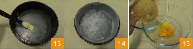 Mientras tanto, preparaos para la preparación del pastel. Engrasad el molde con un hilo de aceite 13 y forradlo con papel de horno 14. En un bol grande verted los huevos junto con el azúcar 15.