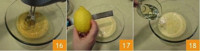 Con una batidora trabajadlos rápidamente 16 hasta obtener una mezcla espumosa. Añadid la ralladura de limón 17 y el aceite de semillas 18.