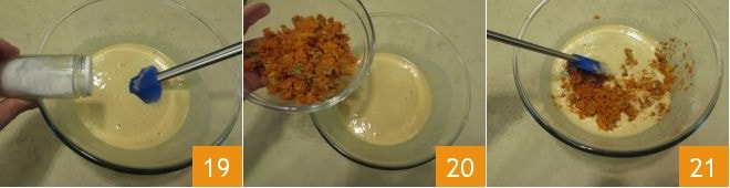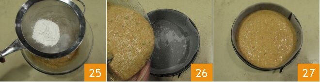 Incorporad a la mezcla también la fécula y la levadura siempre tamizadas 25. Mezclad bien todo, siempre mezclando con una espátula, y vertedlo en el molde (26-27).