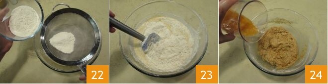 Tamizad las harinas 22, incorporadlas a la masa 23, y añadid también los 80 g de centrifugado 24 siempre continuando a mezclar.