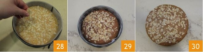 Completad disponiendo las láminas de almendra en la superficie 28. Hornead en horno estático precalentado a 180° durante 35-40 minutos 29 (si utilizáis el horno ventilado, 160° durante unos 30 minutos). Para aseguraros de que el pastel está cocido, haced siempre la prueba del palillo. Dejad enfriar 30, luego sacad el dulce del molde y servid vuestro centrifugado acompañado del pastel con las cáscaras.