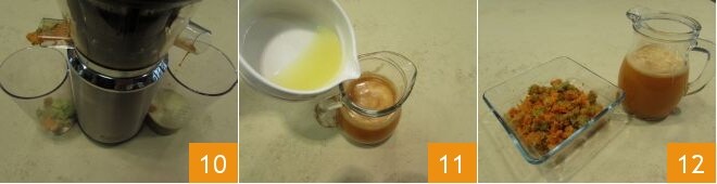 Extraed el zumo de la fruta (470 g), reservando todos los restos que salen (100 g) 10. Exprimid aparte el limón, filtrad el zumo y añadidlo al centrifugado 11. Mezclad todo y guardad vuestra bebida y los restos de las cáscaras en el frigorífico 12.