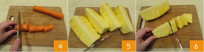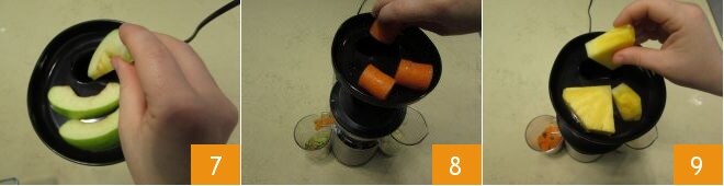 En este punto insertad en la centrifugadora la fruta: los trozos de manzana 7 y de zanahorias 8, ambos con la piel para no privarlos de sus propiedades nutritivas, y por último los de piña 9.