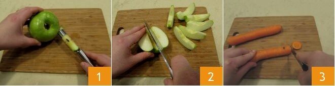Para preparar el centrifugado y el pastel con las cáscaras, comenzad la preparación del centrifugado, empezando por la fruta. Lavad bien las manzanas (podéis utilizar tanto las Granny Smith como las Golden) y quitadles el corazón con el utensilio adecuado 1, luego cortadlas en gajos, sin quitar la piel 2. Lavad también bien las zanahorias y córtadles las puntas 3.