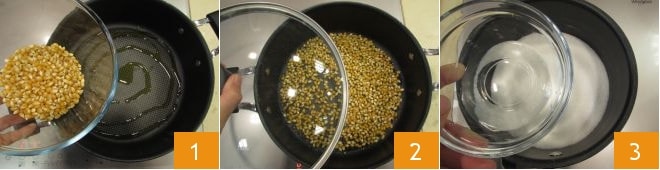 Para realizar los cerebros de Halloween, comenzad preparando las palomitas: en una sartén grande verted un poco de aceite y el maíz 1. Cubrid con una tapa 2 y, a fuego medio, esperad a que los granos de maíz empiecen a explotar. Esta operación tardará unos 10 minutos. Movete la sartén de vez en cuando para que no se quemen. Mientras tanto, preparad el jarabe de glucosa poniendo 250 g de azúcar y 50 g de agua en un cazo 3