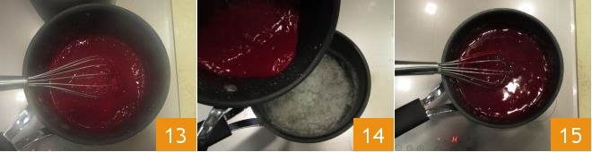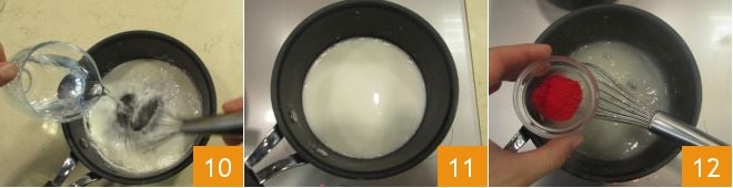 Incorporad 125 g de agua poco a poco mezclando con unas varillas 10, para evitar la formación de grumos. Llevad el cazo al fuego 11 y dejad que llegue a ebullición, sin dejar de mezclar todo con las varillas. Una vez que hierva, agregad el colorante 12
