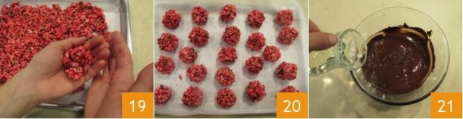 Colocad la bandeja en el frigorífico y dejad que las palomitas se enfríen durante al menos 20/30 minutos. Una vez bien frías, tomad porciones de palomitas con una cuchara de sopa y formad bolas groseramente 19, para realizar esta operación, preparaos un bol con agua para humedeceros las manos antes de formar las bolas. Una vez formadas las bolas, colocadlas en la bandeja forrada con papel de horno 20 –bien espaciadas entre sí- y dejadlas solidificar en el congelador durante al menos 40 minutos -así será mucho más fácil bañarlas-. Derretid el chocolate picado en el microondas y emulsionalo con el aceite de semillas 21