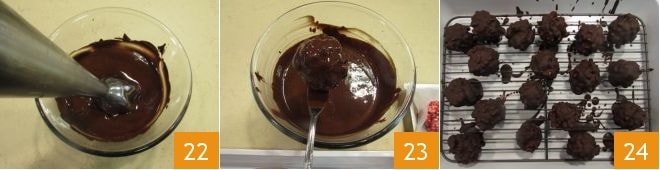 utilizando una batidora de inmersión 22. Pasados los 40 minutos, podéis finalmente bañar vuestros mini cerebros: ayudándoos con un tenedor, sumergidlos en el chocolate 23 y colocadlos sobre una rejilla debajo de la cual habréis puesto una bandeja. Con esta operación eliminaréis el exceso de chocolate. Dejad enfriar vuestros mini cerebros en el frigorífico durante al menos 30 minutos, pasado el tiempo de solidificación vuestros mini cerebros estarán listos para ser degustados 24.