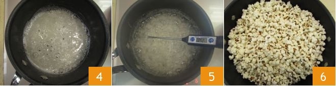 Cuando el azúcar se haya disuelto y la mezcla comience a hervir 4, controlad la temperatura con un termómetro y retirad del fuego cuando haya alcanzado una temperatura de 125 grados. 5 Esta operación tardará unos 10 minutos. Mientras tanto, las palomitas estarán listas 6, reservadlas para que se enfríen