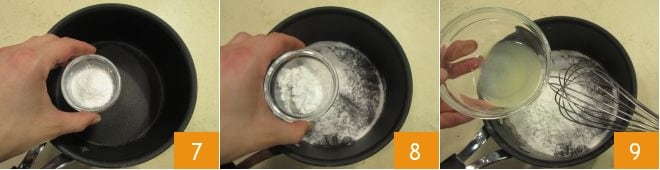 Mientras tanto, en otro cazo verted la fécula de maíz 7, gelatina en polvo 8 y el zumo de limón 9.