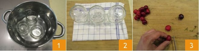 Para preparar las cerezas en aguardiente, comienza por la desinfección de los frascos, como se indica en las directrices del Ministerio de Salud al final de la receta. Llena una olla con agua, añade los frascos y déjalos hervir a fuego lento durante unos 30 minutos 1. Luego sácalos del agua con cuidado de no quemarte y colócalos boca abajo sobre un paño de cocina 2. Déjalos secar y mientras tanto, ocúpate de las cerezas: lávalas y corta la punta del tallo con unas tijeras 3.