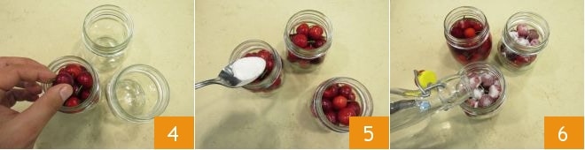 Coloca las cerezas dentro de los frascos 4, añade el azúcar (serán unos 15 gr por cada frasco) 5 y cubre con el aguardiente 6. Según el tamaño de las cerezas y de los frascos que elijas, puede que te sobre aguardiente.