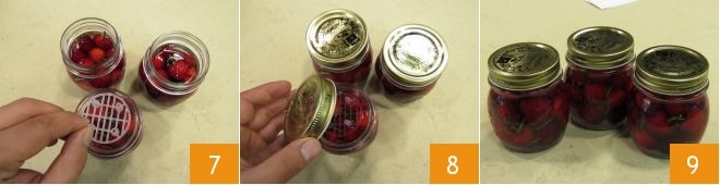 Inserta un prensador de plástico en cada frasco 7, presiona bien y cierra los frascos apretando firmemente pero sin exagerar 8. Déjalos macerar en un lugar fresco y seco durante al menos 30 días antes de disfrutar de tus cerezas en aguardiente 9!