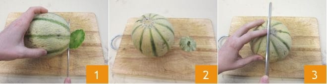 Para preparar las cestas de jamón y melón, primero hay que tallar los melones para obtener pequeños recipientes que luego rellenaremos. Comiencen cortando una rodaja en la parte superior del melón 1. Ahora voltéenlo, apoyándolo sobre la parte cortada 2 que así resultará más estable. Procedan ahora con el corte de lo que pronto se convertirá en el asa de la cesta. Realicen en la parte superior de la fruta, a unos 1,5 cm del pedúnculo, un corte profundo que llegue hasta la mitad del melón 3.