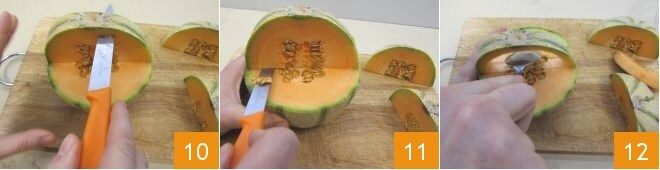 Sigan la forma del melón 10 y concluyan realizando un corte horizontal 11; retiren la semiluna de pulpa obtenida. Ahora pueden cavar ayudándose con una cuchara para eliminar las semillas 12