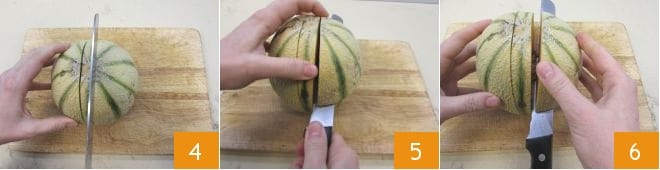 Realicen luego un corte igual y paralelo, distanciándolo del otro unos 3 cm 4. Inserten también en este caso el cuchillo hasta la mitad del melón, como si quisieran cortar una rodaja. Ahora corten 1 de los dos gajos laterales obtenidos y retírenlo (5-6)