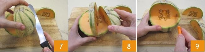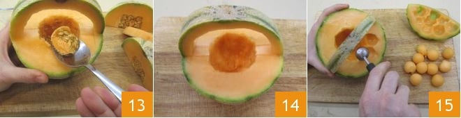y los filamentos del corazón del melón (13-14). Recopilen la pulpa de la fruta en pequeñas esferas ayudándose con un sacabolas 15