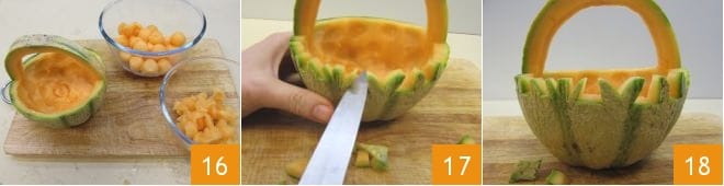 recogiéndolas en un recipiente a medida que estén listas, y hasta que el melón esté completamente vaciado 16. Con la ayuda de un cuchillo de hoja afilada, incidan ahora los bordes de la cesta obtenida, hasta darle un perfil festoneado (17-18).