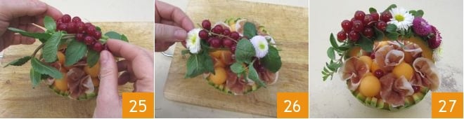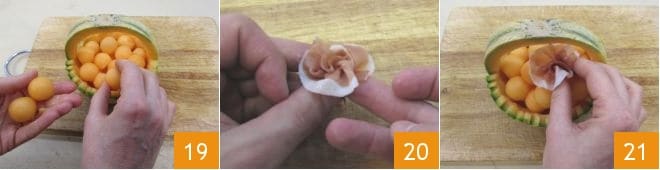Es momento de llenar la cesta: coloquen en su interior las esferas de pulpa de melón 19 y las rositas obtenidas enrollando en un capullo las lonchas de jamón (20 y 21),