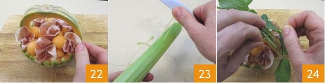 disponiéndolas a distancia regular para darles el aspecto compuesto de un bouquet 22. Obtengan ahora hilos de apio, tirando suavemente con la ayuda de un cuchillo algunos largos filamentos externos como se muestra en la imagen 23. Utilicen los hilos de apio para atar al asa de la cesta de melón las ramitas de menta fresca 24,
