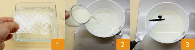 Para preparar las cestitas de pasta filo con cremoso de chocolate blanco y mermelada de frutos del bosque, poned la gelatina en hojas a remojar en un recipiente con agua fría 1. En un cazo, verted la leche y la nata 2, luego cortad la vaina de vainilla a lo largo y con un cuchillo sacad las semillas rascándola; añadid las semillas y la vaina de vainilla a la leche y la nata 3, calentando hasta que comience a hervir.