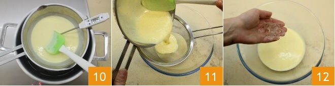 Poned el compuesto que habéis obtenido en un cuenco y calentadlo al baño maría, mezclando bien con las varillas y asegurándoos de que el agua caliente de la cazuela no toque la parte inferior del recipiente. Llevad el compuesto a 85°, controlando la temperatura con un termómetro de cocina 10. Una vez alcanzada la temperatura, apagad el fuego y trasladad la crema a un bol grande, filtrándola con un colador de malla fina 11. Escurrid la gelatina en hojas (que mientras tanto se habrá ablandado) y añadidla a la crema 12.