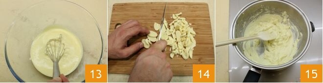 Mezclad con las varillas hasta que la gelatina se haya derretido 13, luego picad finamente el chocolate blanco 14, haciéndolo derretir al baño maría 15.