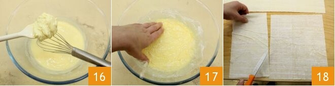 Una vez que el chocolate se haya derretido, añadidlo a la crema mezclando con las varillas 16. Cuando hayáis obtenido una consistencia lisa y homogénea, verted la crema que habéis obtenido en un recipiente y cubrid con film transparente en contacto 17; dejadla enfriar a temperatura ambiente (para acelerar los tiempos, poned la crema en un bol lleno de hielo) y luego guardadla en el frigorífico. Cuando la crema se haya enfriado completamente, si queréis, podéis verterla en una manga pastelera sin boquilla, a la cual podéis hacer un agujero, conservándola siempre en el frigorífico hasta el momento del uso. Mientras tanto, preparad las cestitas: tomad 4 hojas de pasta filo de tamaño 48x25 cm. Con un cuchillo, cortad 6 cuadrados iguales de 13 cm 18.