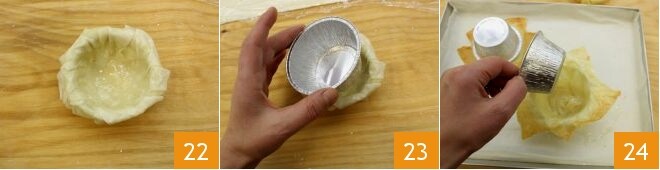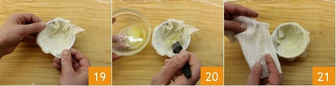 Derretid la mantequilla en un cazo o en el microondas; forrad 6 moldes de aluminio de 9 cm con una hoja de pasta filo a la vez, que presionaréis bien para que se adhiera al molde y forme una cestita 19: recordad que la pasta filo es muy delicada, tened cuidado de no perforar el fondo, para evitar que el relleno se salga durante la cocción. Pincelad con la mantequilla derretida entre una capa y otra 20 y continuad 21: en total debéis superponer 4 hojas de pasta filo por cada molde; podéis decidir si doblar las esquinas de la cestita o dejarlas salir como decoración.