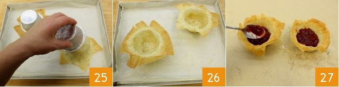 Mientras tanto, lavad los frutos del bosque, que servirán como guarnición, bajo abundante agua fría corriente. Cuando las cestitas estén listas, desmoldadlas 25 y dejadlas enfriar completamente 26. En este punto, podéis componer vuestros postres: en el fondo, rellenadlas con la mermelada de frutos del bosque 27,