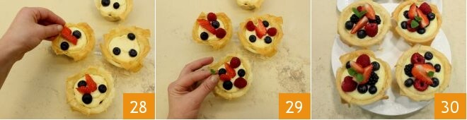 luego verted el cremoso de chocolate blanco. Terminad añadiendo los frutos del bosque al gusto 28 y una hojita de menta 29; vuestras cestitas de pasta filo con cremoso de chocolate blanco y mermelada de frutos del bosque están listas 30.