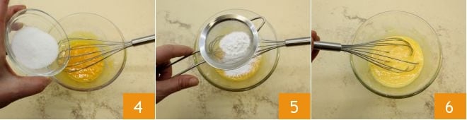 En un bol aparte, batid las 2 yemas de huevo junto con el azúcar 4 y el almidón de maíz tamizado 5. Mezclad con las varillas hasta que los huevos y el azúcar estén bien integrados 6.