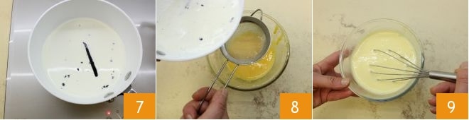 Cuando la leche y la nata estén a punto de hervir 7, apagad el fuego y retirad la vaina de vainilla que habéis dejado en infusión. Verted entonces la mezcla de leche y nata caliente hilándola en el compuesto a base de huevos, filtrándola con un colador 8 y continuando con las varillas para amalgamar bien los ingredientes 9.