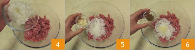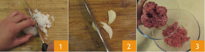Para realizar los cevapcici, primero pelad y picad finamente la cebolla 1 y el ajo 2, luego verted los 3 tipos de carne picada en un bol grande 3.