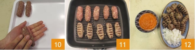Después de este tiempo, retomad la mezcla y formad albóndigas cilíndricas de unos 10 cm de largo y 2 cm de ancho, trabajándolas entre las palmas de las manos 10. Mientras tanto, calentad bien una plancha. Después de formarlos, cocinad los cevapcici en la plancha durante unos 7 minutos, dándoles la vuelta a menudo para asegurar una cocción uniforme 11: deben quedar dorados por fuera pero aún suaves y jugosos por dentro. Servid los cevapcici aún calientes o templados, tal vez acompañados de cebolla cruda y salsa ajvar como es tradicional 12!
