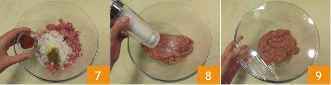 Añadid también el pimentón 7 y amasad con las manos para obtener una mezcla homogénea, luego ajustad de sal 8 y de pimienta y amasad nuevamente. Cubrid el bol con film transparente 9 y dejad en el frigorífico al menos 2 horas, para permitir que los sabores se mezclen.