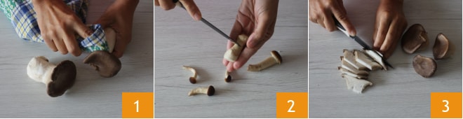 Para realizar las setas gratinadas al horno comienza limpiando las setas: corta la base del tallo más sucio, luego elimina el exceso de tierra frotando suavemente con un paño húmedo tanto los pleurotus 1 como los hongos de chopo. Si es necesario, ráspalos con un cuchillo de hoja lisa 2. Si hay mucha tierra, puedes pasar rápidamente las setas bajo un chorro de agua fría, pero sería preferible no hacerlo para evitar que las setas absorban agua. Corta los sombreros de los pleurotus y córtalos en rebanadas 3 de aproximadamente 3 milímetros de grosor.