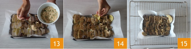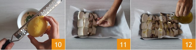 y la ralladura de medio limón 10. Finalmente, añade la sal y mezcla para integrar los ingredientes. Coloca las rebanadas de setas en una bandeja para hornear forrada con papel de horno 11, solapándolas ligeramente unas con otras. Condimenta con 15 gramos de aceite de oliva virgen extra 12.