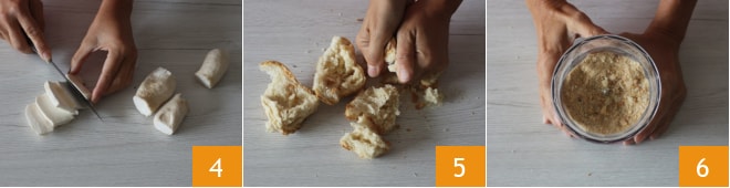 Corta de la misma manera los tallos 4. Deja los hongos de chopo enteros. Desmenuza con las manos el pan duro 5. Tritúralo con una batidora 6 y colócalo en un bol.