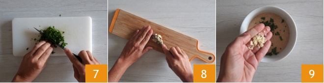 Pica finamente el perejil fresco 7 y el ajo 8. Sazona el pan con el perejil, el ajo 9
