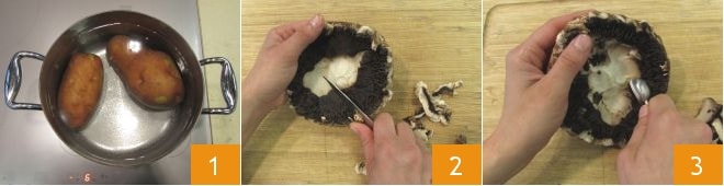 Para preparar los hongos portobello rellenos, lo primero que tenéis que hacer es poner las patatas en un cazo con abundante agua fría 1 y cocerlas hasta que podáis pincharlas fácilmente con el tenedor. Mientras tanto, ocupáos de la limpieza de los hongos: recortad los bordes de las cabezas con un cuchillo para eliminar posibles partes dañadas 2 y vaciadlas delicadamente con un vaciador 3.