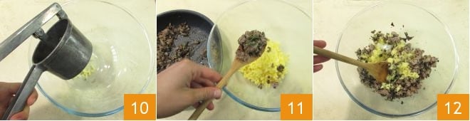 Cuando las patatas estén cocidas, machácalas en un bol con la ayuda de un machacador de patatas 10, luego añade la mezcla de hongos y salchicha 11, ajusta de sal si es necesario y mezcla bien 12.
