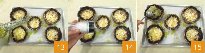 Coloca las cabezas de los hongos en una bandeja de horno forrada con papel de horno y alíñalas con un chorrito de aceite 13 y una pizca de sal 14. Rellena los hongos con el relleno de patatas 15