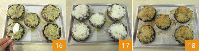 y espolvorea la superficie con el Pecorino rallado (16-17), luego añade una última molienda de pimienta. Cocina en horno estático precalentado a 200°C durante 25 minutos, después enciende el grill y continúa la cocción durante otros 5 minutos. ¡Tus hongos portobello rellenos están listos para ser disfrutados 18!
